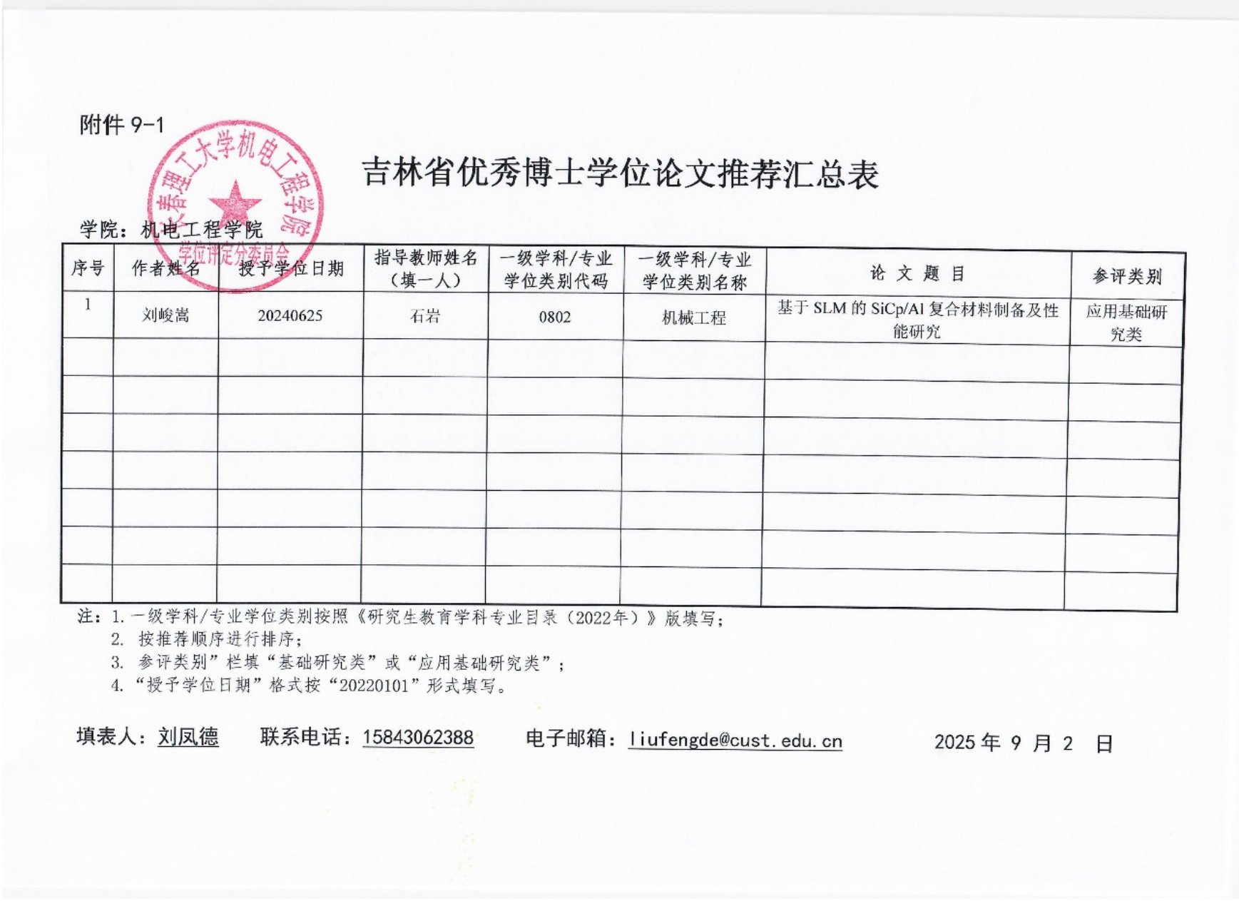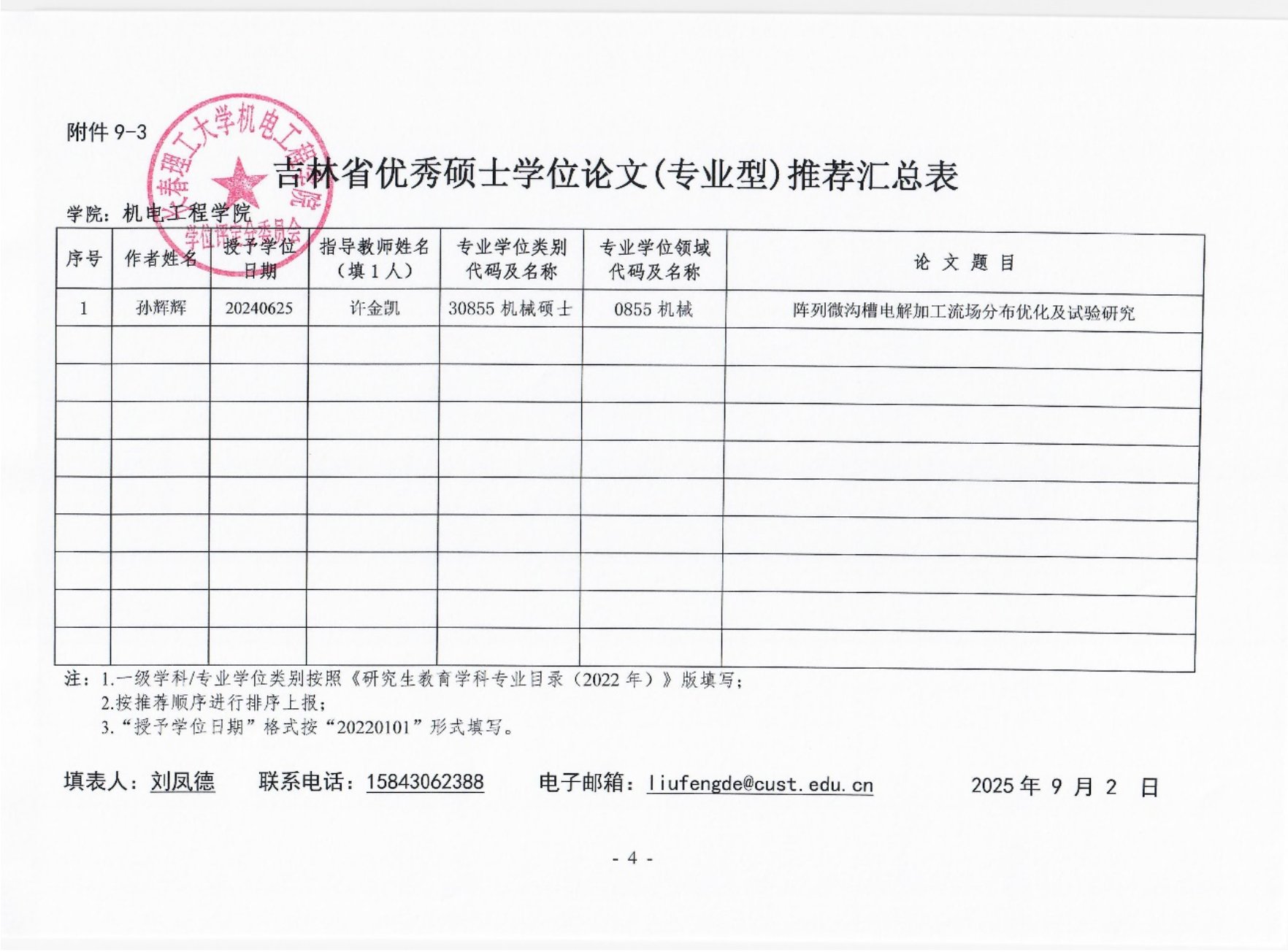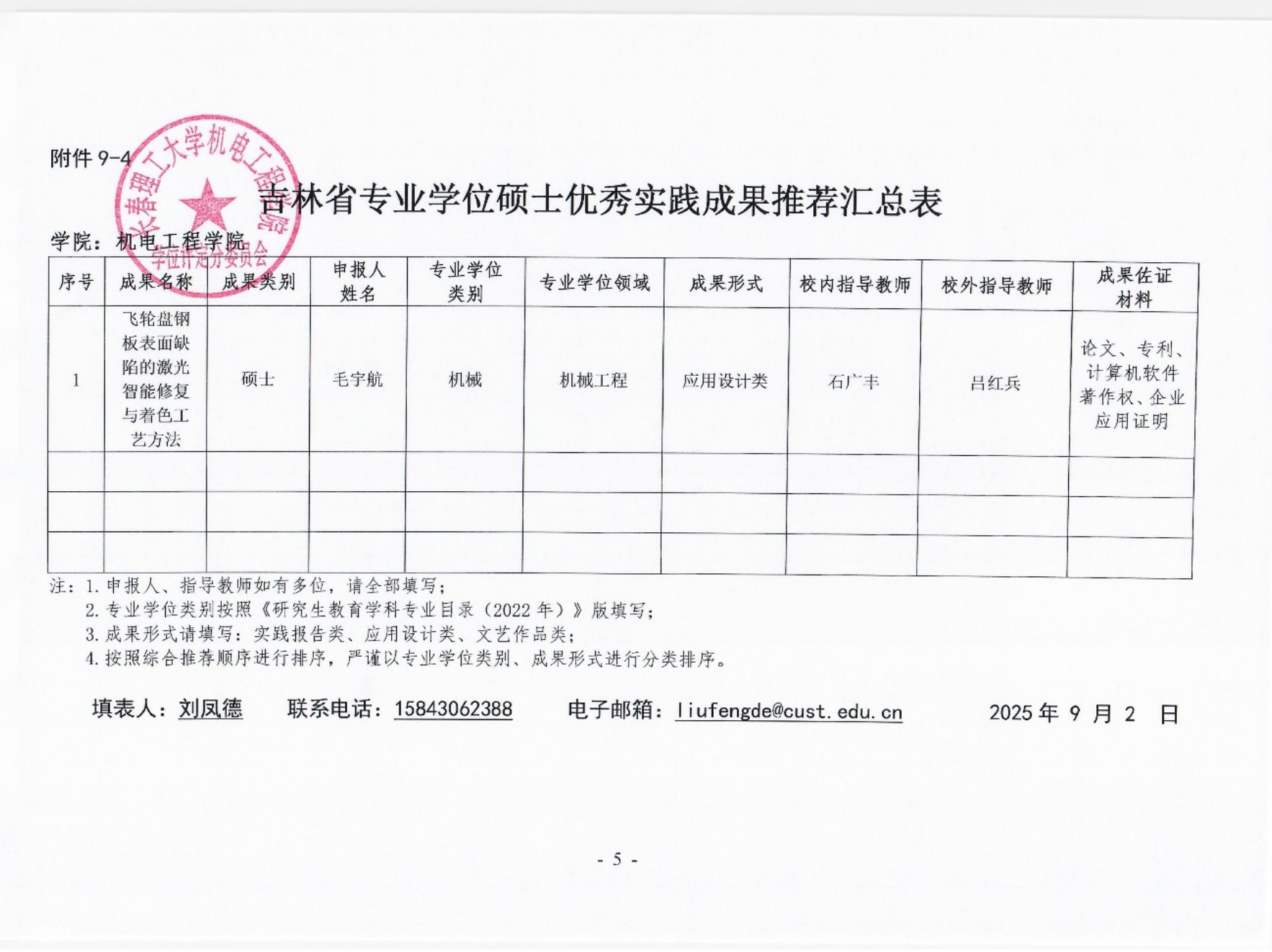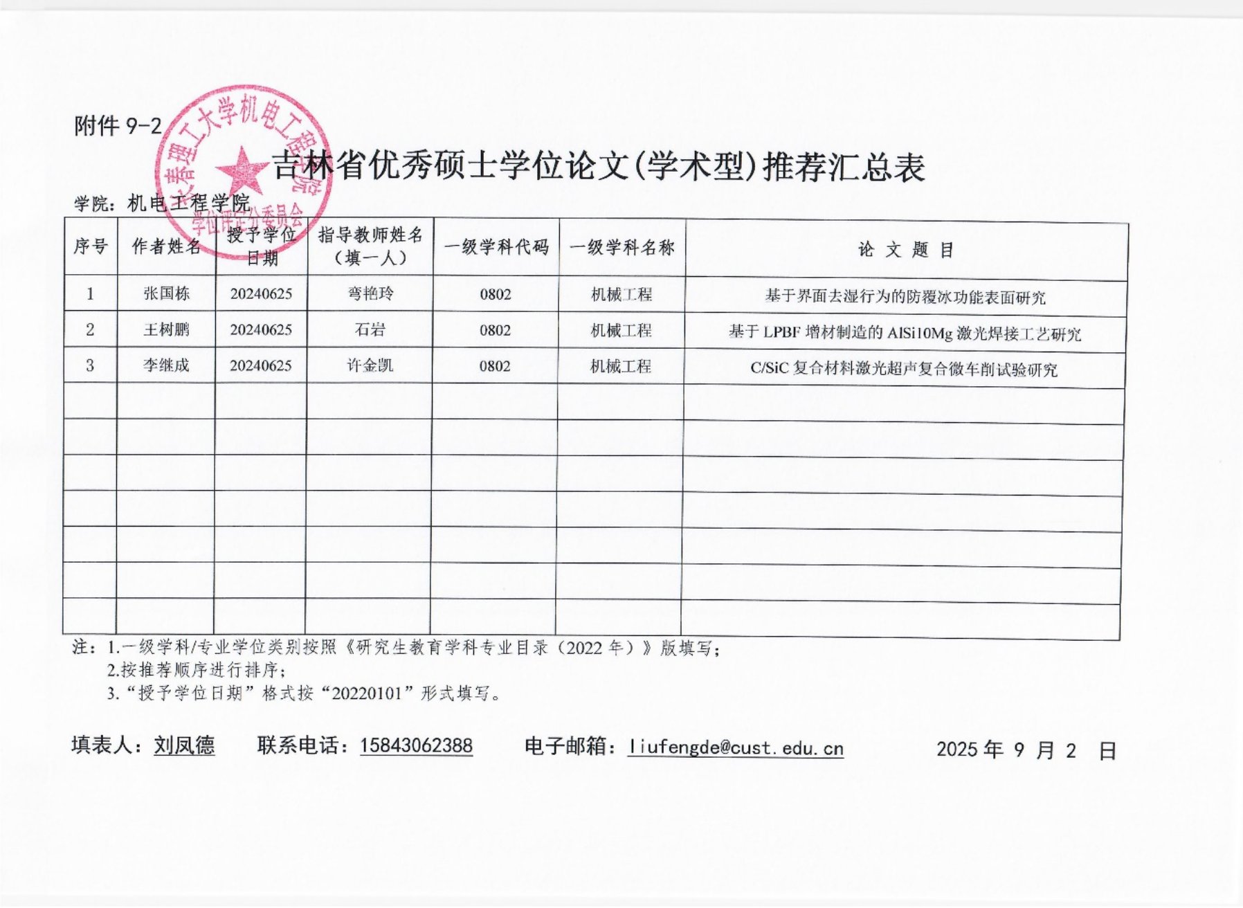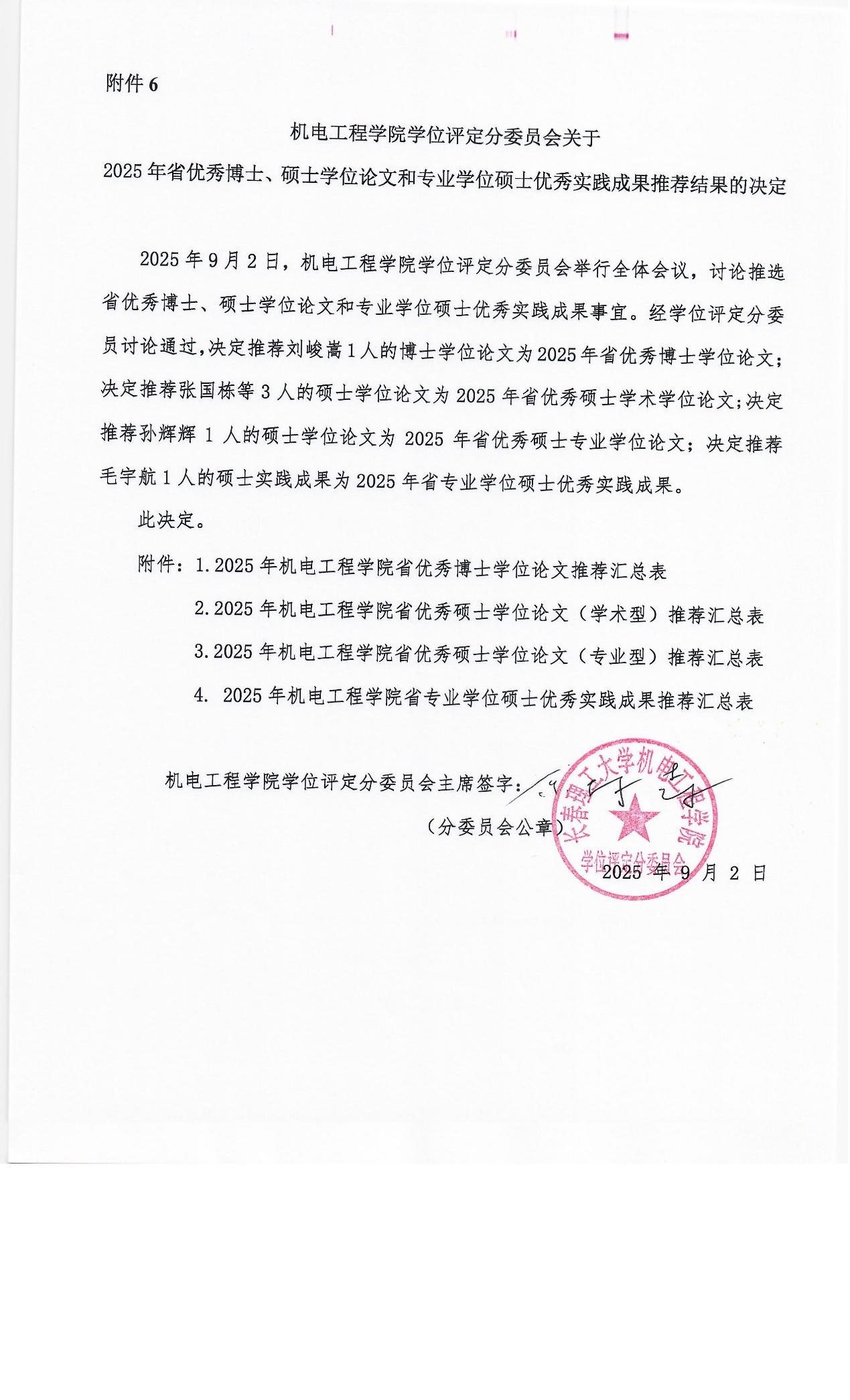 机电工程学院学位评定分委员会关于2025年省优秀博士、硕士学位论文和专业学位硕士优秀实践成果推荐结果的决定
